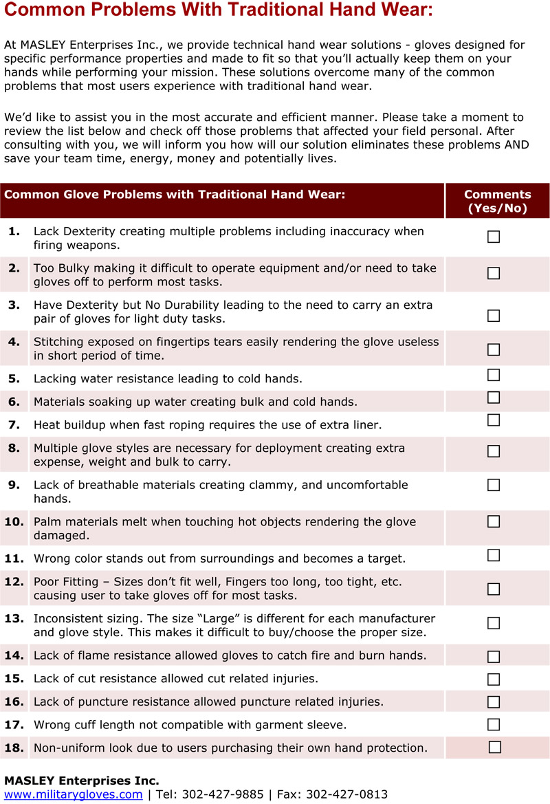 Download this page in PDF format At MASLEY Enterprises Inc., we provide technical hand wear solutions - gloves designed for specific performance properties and made to fit so that you’ll actually keep them on your hands while performing your mission. These solutions overcome many of the common problems that most users experience with traditional hand wear. We’d like to assist you in the most accurate and efficient manner. Please take a moment to review the list below and check off those problems that affected your field personal. After consulting with you, we will inform you how our solution eliminates these problems AND save your team time, energy, money and potentially lives. 1. Lack Dexterity creating multiple problems including inaccuracy when firing weapons. 2. Too Bulky making it difficult to operate equipment and/or need to take gloves off to perform most tasks. 3. Have Dexterity but No Durability leading to the need to carry an extra pair of gloves for light duty tasks. 4. Stitching exposed on fingertips tears easily rendering the glove useless in short period of time. 5. Lacking water resistance leading to cold hands. 6. Materials soaking up water creating bulk and cold hands. 7. Heat buildup when fast roping requires the use of extra liner. 8. Multiple glove styles are necessary for deployment creating extra expense, weight and bulk to carry. 9. Lack of breathable materials creating clammy, and uncomfortable hands. 10. Palm materials melt when touching hot objects rendering the glove damaged. 11. Wrong color stands out from surroundings and becomes a target. 12. Poor Fitting – Sizes don’t fit well, Fingers too long, too tight, etc. causing user to take gloves off for most tasks. 13. Inconsistent sizing. The size “Large” is different for each manufacturer and glove style. This makes it difficult to buy/choose the proper size. 14. Lack of flame resistance allowed gloves to catch fire and burn hands. 15. Lack of cut resistance allowed cut related injuries. 16. Lack of puncture resistance allowed puncture related injuries. 17. Wrong cuff length not compatible with garment sleeve. 18. Non-uniform look due to users purchasing their own hand protection. > Many Ways to Wear!